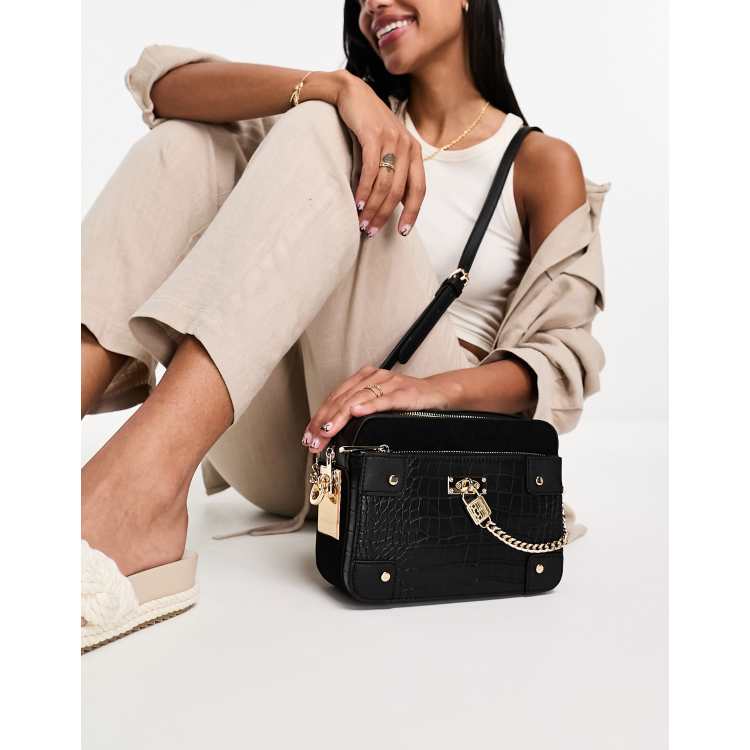 Black croc embossed store boxy cross body bag
